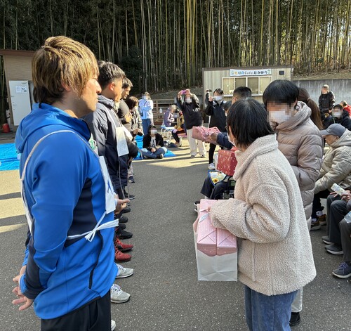 本施設とは40年以上続く交流があり、選手は施設の中の敷地内にて自転車走行を披露し、施設の方々に沢山の声援をいただきました。