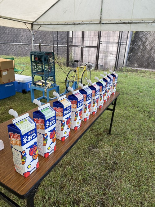 熊本支部はゴール地点で、競輪競走で使用するピストレーサーとかき氷機を合体させ、自転車を漕ぐことでかき氷ができる装置を使用し、かき氷を無料配布するイベントを開催しました。